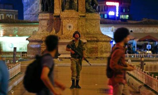 2016年7月16日凌晨,在伊斯坦布尔的塔克西姆广场,土耳其军人控制了局面,支持埃尔多安总统的民众举行抗议。